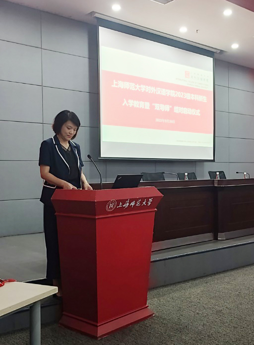 首先进行的是2023级本科新生入学教育暨“双导师”结对启动仪式。篮球比分网 院长曹秀玲老师介绍了篮球比分网 整体规模及院训精神,向新加入篮球比分网 大家庭的本科新生表示了衷心欢迎,并寄语同学们“不负青春韶华,不负时代重托”。副院长张巍老师介绍了汉语国际教育专业的相关情况,包括发展历程、培养方案、办学理念、人才培养特色四方面,帮助本科新生更加清晰地认知所学专业,擘画未来发展蓝图。王彦清同学作为2023级本科新生代表进行发言,她阐述了自己选择本专业的原因,并勉励全体新生成为心怀理想、勇于担当的新时代青年。