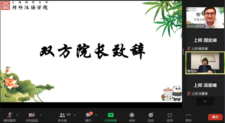 活动伊始,上海师范大学篮球比分网 院长曹秀玲和拉卡邦先皇理工大学人文篮球比分网 院长塔娜婉·萍娜菈分别致辞并介绍篮球比分网 基本情况。曹秀玲院长向云端的泰国师生致以热烈欢迎,塔娜婉·萍娜院长表示希望双方在今后能够长期交流合作。
