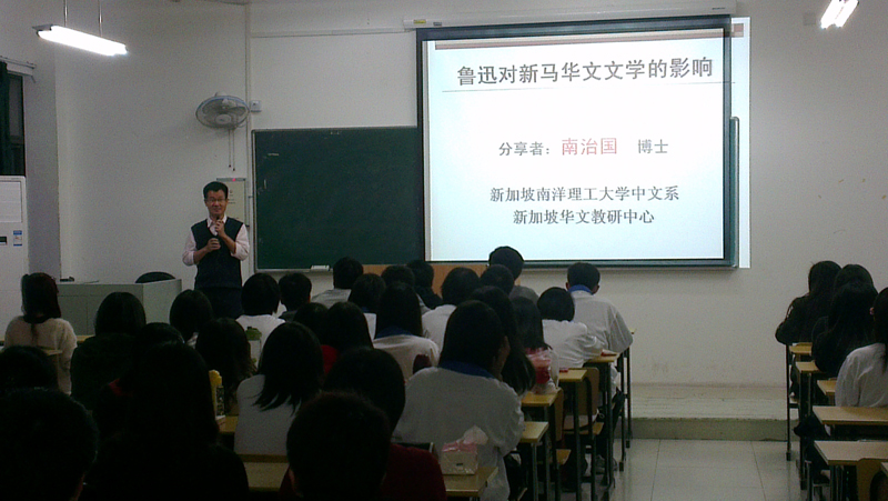 | 为了加深一二年级本科生对专业的认识,拓展学生的国际视野,球探网篮球比分 本学期邀请到了新加坡教育部华文教研中心讲师兼课程部副主任南治国教授为球探网篮球比分 低年级本科生开设了一次讲座。讲座于2012年10月18日晚在五教A座304如期进行,讲座题目为《鲁迅对新马华文文学的影响》。 在讲座中,南教授从新马华文文学的起源谈起,从中梳理了中国现代大陆作家群体对新马华文文学的影响,并对其中影响最大的鲁迅进行了集中阐述。在讲座中,他从鲁迅笔下的一个小人物阿Q在新马华文文学作品中不同时期的不同演绎入手,详细描述了以《故乡》、《阿Q正传》为代表的鲁迅作品对新马华文文学创作风格、思想性等方面的影响。同时,他还指出了新马华文文学在高举鲁迅革命民主主义和现实主义伟大旗帜的同时又发展出了具有自我地域、社会色彩的特性,为我们更加深入了解鲁迅作品的思想内涵提供了参考。讲座提问环节,同学们就鲁迅作品的思想性、新加坡华文教育现状、新加坡华文教师培养选拔等方面向南教授进行了咨询。现场气氛热烈,学生反响良好。 据悉,球探网篮球比分