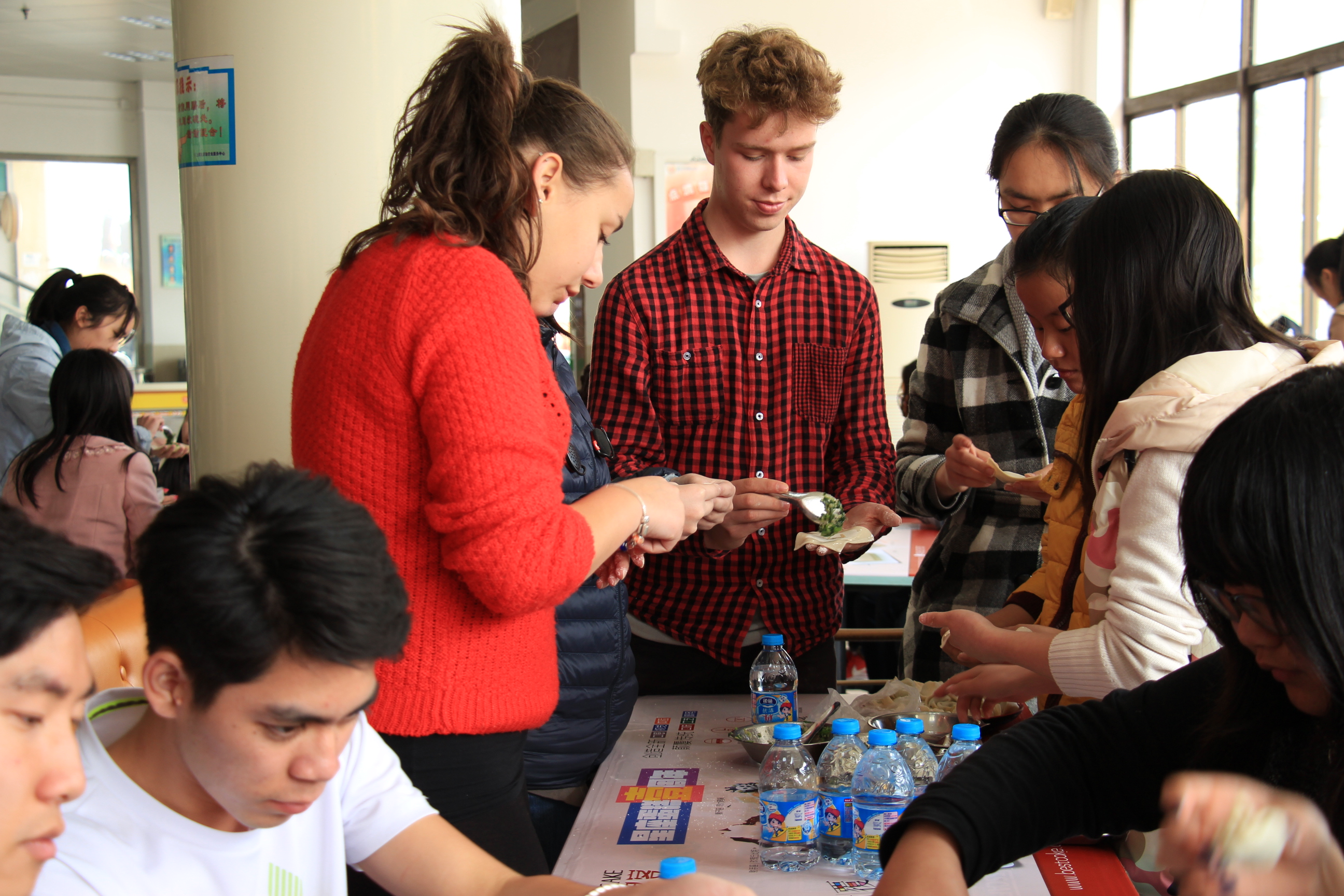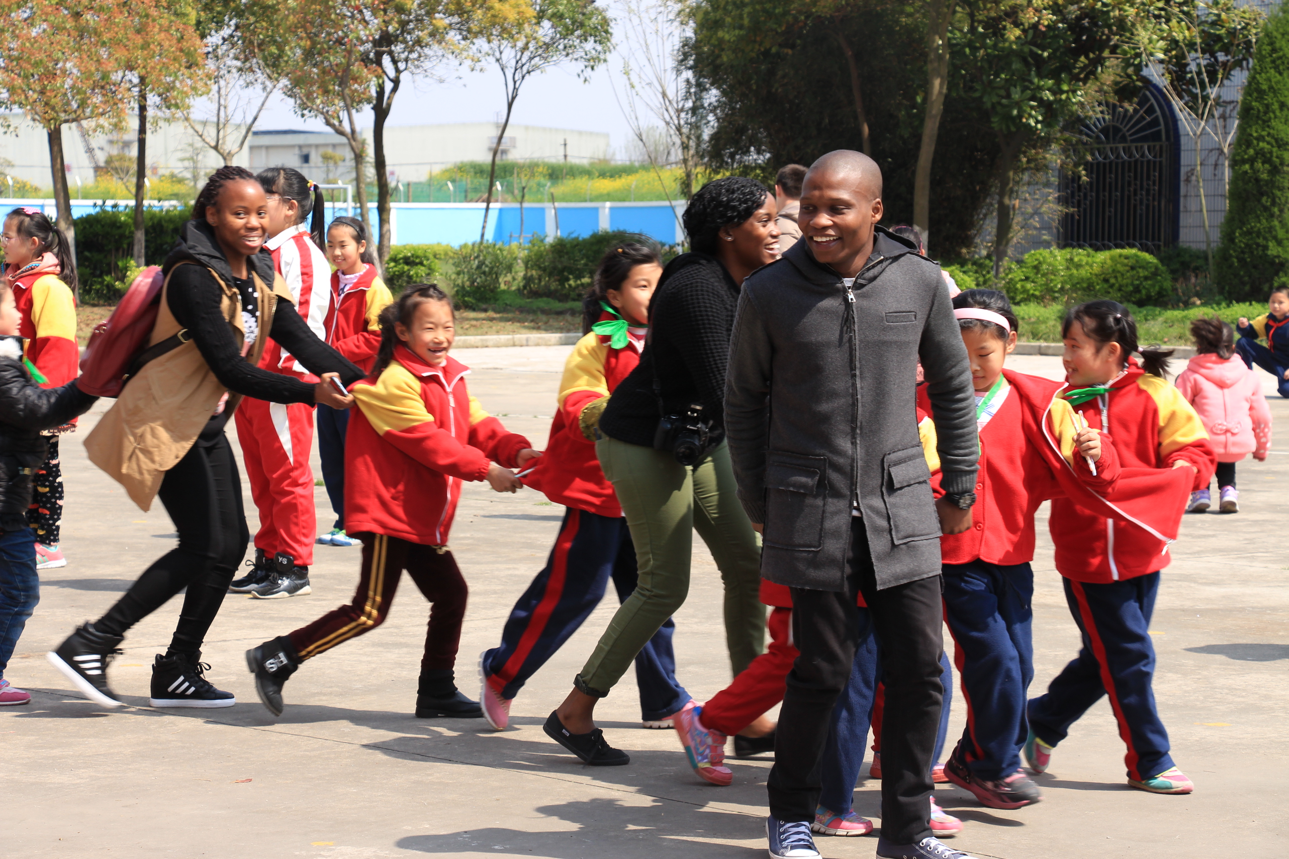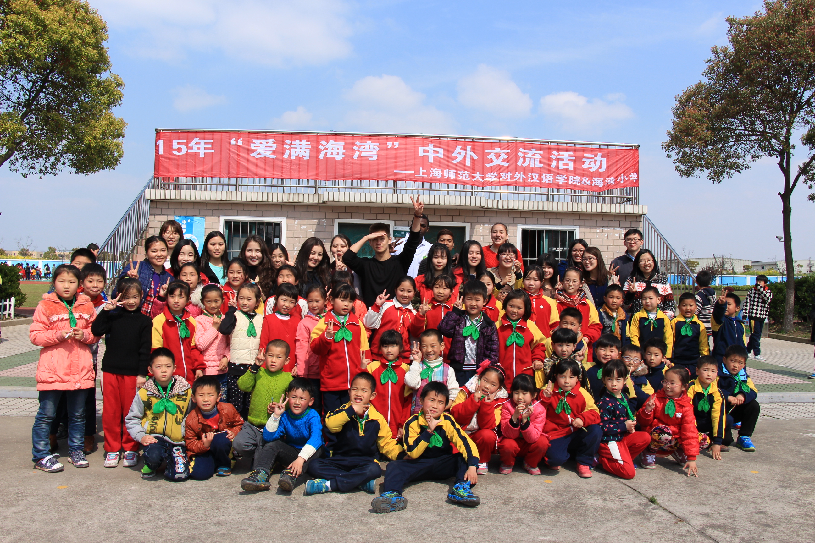 党总支书记武长河、副书记唐洁、团委书记蔡俊杰一同参与了活动。 下午1点,两辆大巴驶入海湾小学校园,热烈沸腾的欢呼声,好奇期盼的眼神,小学生们对留学生的到来表现出了极大的热情。外国学生同样兴奋不已,用不太熟练的汉语热情地打招呼。志愿者们先按班级把小学生分为四组与相应的外国留学生结对,然后排队到大操场上开始交流活动。有的外国留学生为小朋友表演节目、介绍自己或自己的国家,让小朋友们增长见识开阔眼界;有的留学生带着小朋友一起玩老鹰抓小鸡和丢手绢游戏,欢声笑语童心荡漾;有的留学生则跟着小朋友学做广播操,充分体验中国小学生的活力。最后中外志愿者与小学生一起合影,记录下这美好春日的动人一刻。 接着,中国本科学生与外国留学生来到紫藤一楼。中国学生向留学生介绍中国饮食文化,并一对一耐心地教外国留学生包中国传统美食春卷和馄饨。外国留学生无不惊叹传统小吃手法的精致与细腻,纷纷动手,边学边交流,现场气氛顿时热闹起来。在一番辛苦之后,中外学生共同品尝自己的劳动成果,共享美食的美好时刻。 “春暖童心,爱无国界”,中外志愿者用自己的爱心激发了民工子弟的好奇心和求知欲,在春日融融的日子里放飞梦想和希望;“美哉中国,美在外汉”,中外学生中国学生与留学生结对,也让外国留学生享受中国传统美食,亲身体验了中国传统文化。 (供稿:王惠英)