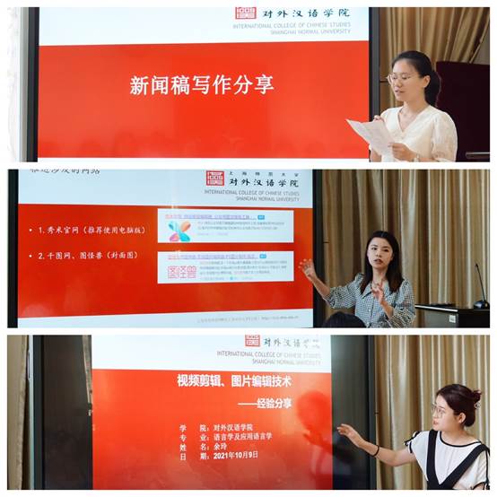 研会副主席汪弘介绍了新闻稿件写作的相关内容,从新闻稿件的标题、结构、语言表达等方面和研会成员进行了分享。网宣部部长赵芃在微信推送经验分享中向大家展示了制作步骤、推送规则、上传视频的方法以及封面图制作等。新媒体部副部长余玲就视频剪辑和图片编辑技术进行了经验交流,详细介绍了不同等级的剪辑软件、剪辑的知识点、常用网站等几方面的知识。