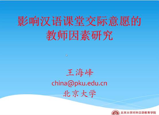 讲座伊始,王海峰教授解释了什么是“交际意愿”及其在二语课堂教学中的重要性。他提出,作为一名对外汉语教师不能只从学生自身去研究影响交际意愿的因素,也要从教师的角度去研究。王教授结合自身的教学实践,通过问卷调查和焦点式写作等方法,从教师和学生两个方面考察汉语课堂教学中教师因素对学生交际意愿的影响。他将影响学生交际意愿的教师因素归纳为课堂管理、授课方式、活动组织等10个维度。随后,王教授通过这10个维度的数据分析,向大家清晰直观地展示了教师因素对汉语课堂交际意愿的影响。