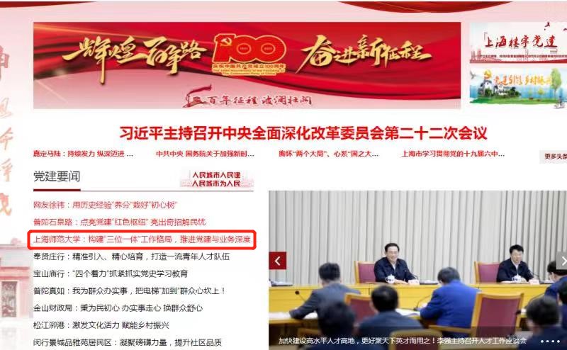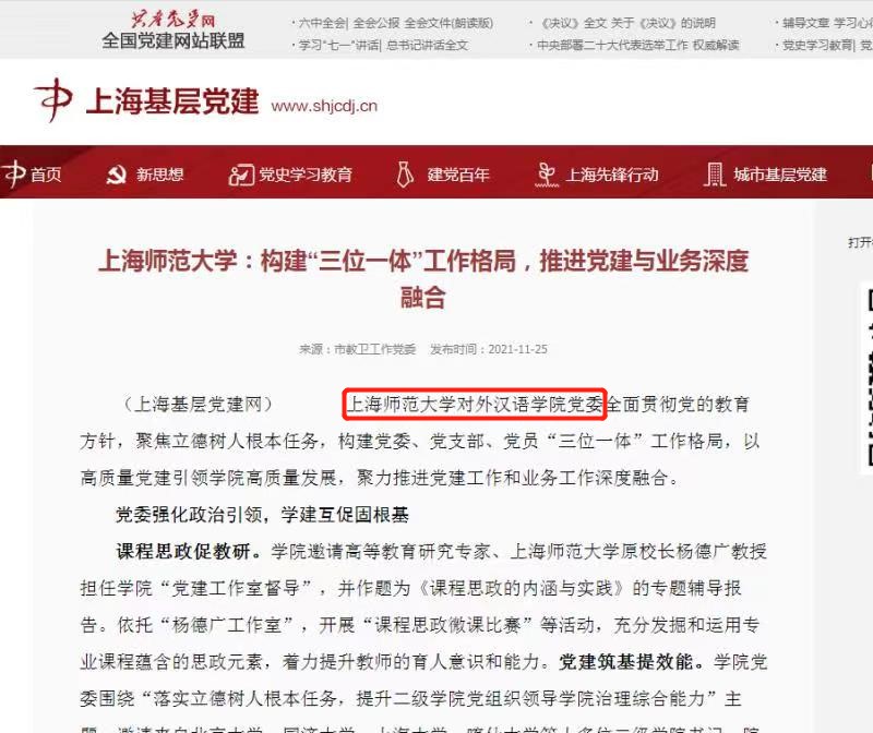 11月25日,上海基层党建网以“上海师范大学:构建‘三位一体’工作格局,推进党建与业务深度融合”为题,主页专题报道了球探网篮球比分 党委、党支部、党员在深度融合党建工作和业务工作方面的经验成效。
