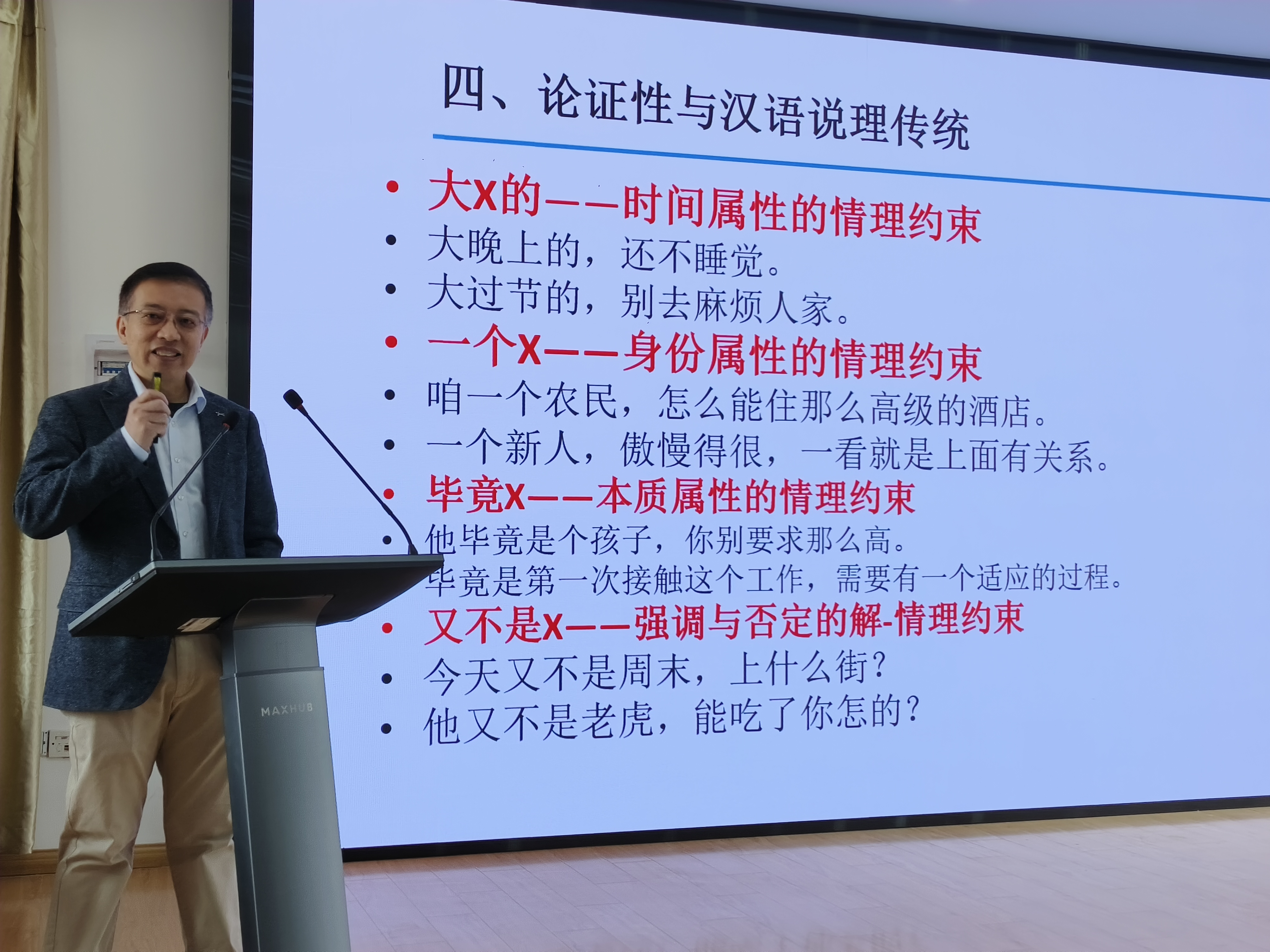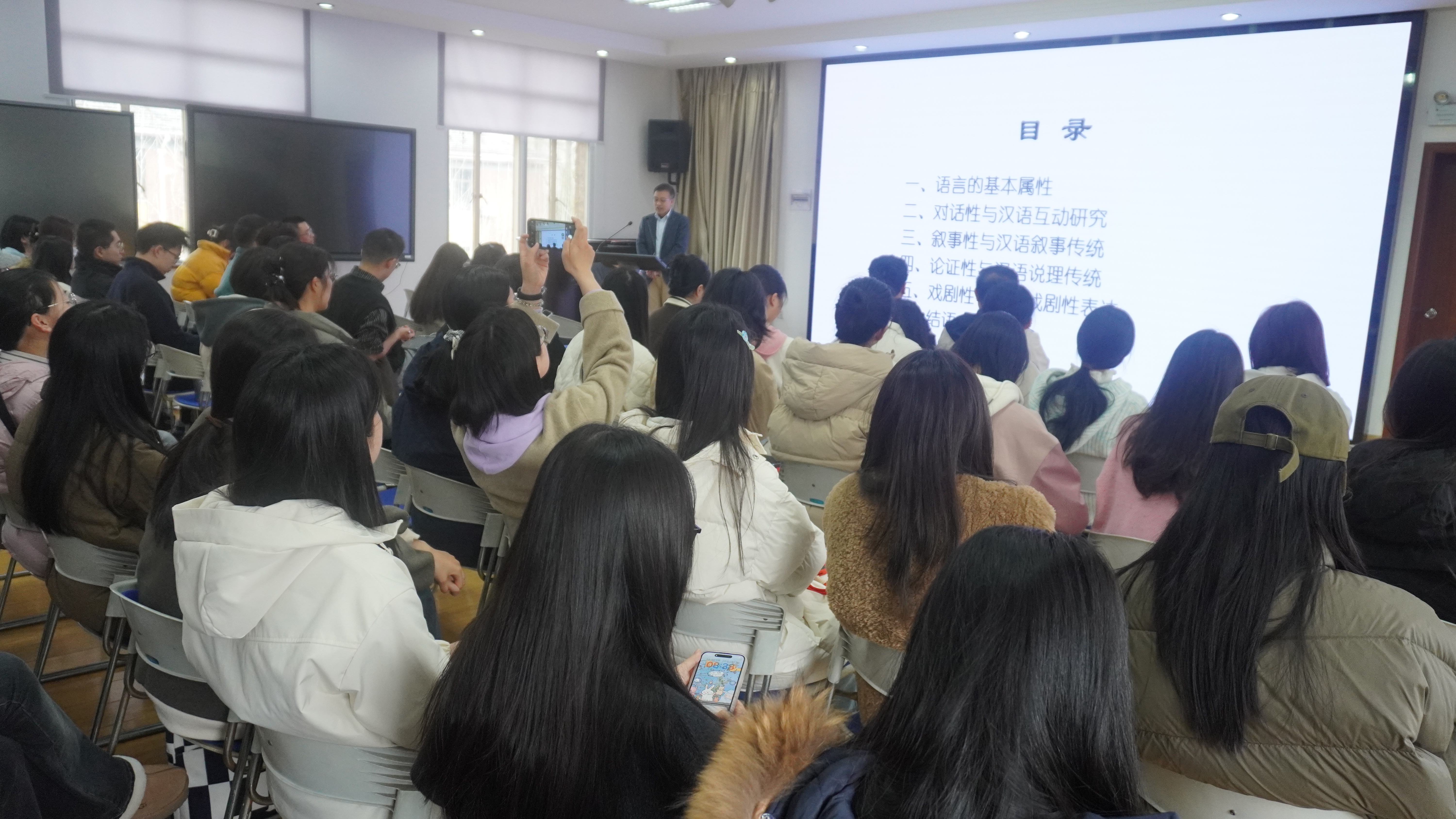 在互动环节,朱庆祥教授就“戏剧性表达的语法表征”与史教授展开学术对谈,现场师生进行深入探讨。讲座最后,李文浩教授作了总结发言,指出史教授的报告为语法学研究提供了新的视角,鼓励同学们在论文写作过程中积极加以吸收和借鉴。