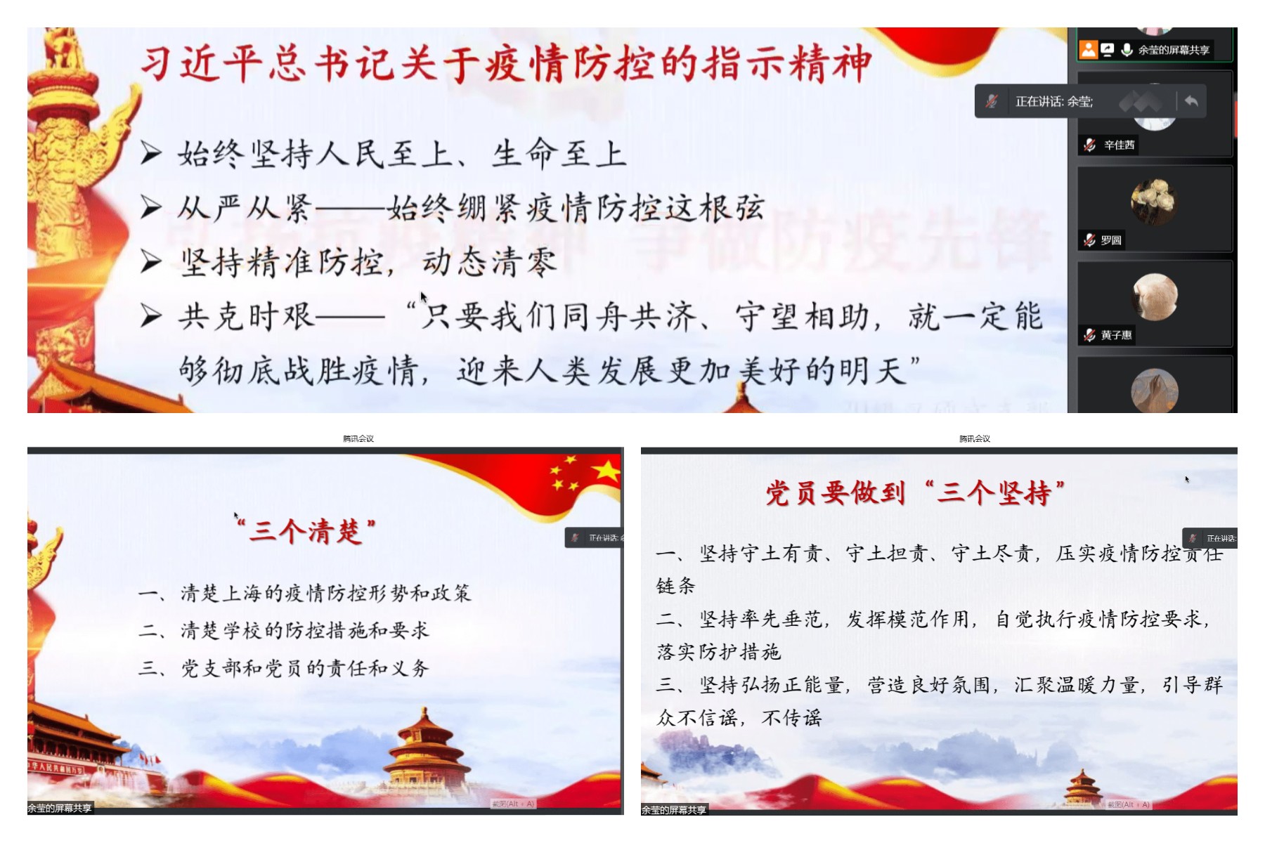 各党支部书记首先结合上海的疫情形势,对支部各成员的生活情况进行了解和问候,并嘱咐大家切实配合学校、街道或社区的防疫工作要求,在保证自身健康安全的前提下,充分发挥党员先锋模范作用,积极参与志愿服务。