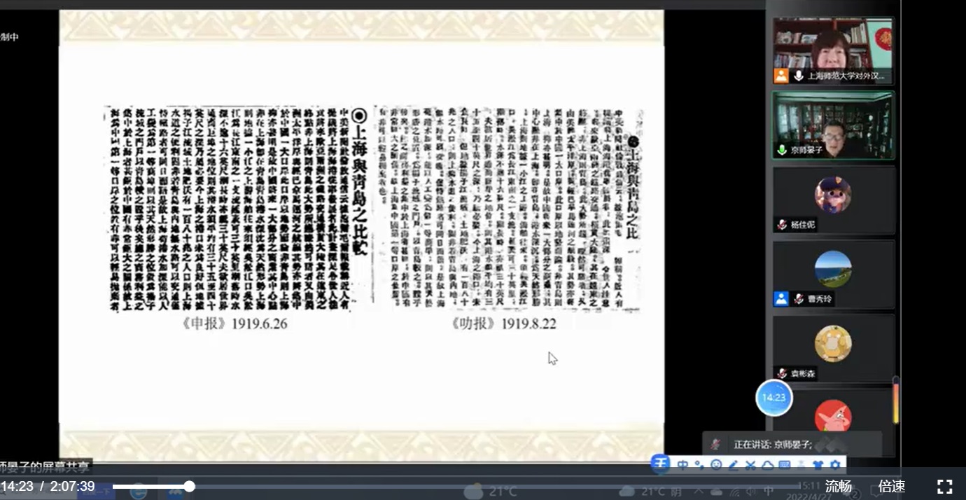 讲座伊始,刁晏斌教授介绍了讲座的研究对象——海外华语,并以一百多年前的报纸引入本次讲座的第一部分内容“你从哪里来:海外华语的前生”。刁教授指出,海外华语来自中国,通过国语教育、国语文学以及大众媒体传播到了海外。他展示了100多年前上海的《申报》、新加坡的《新国民日本》,以及早期的教课书等,再现了华语的传播渠道。刁教授还通过对“经已”“日昨”“开幕”等词语的分析,进一步说明早期国语与海外华语的源流关系。