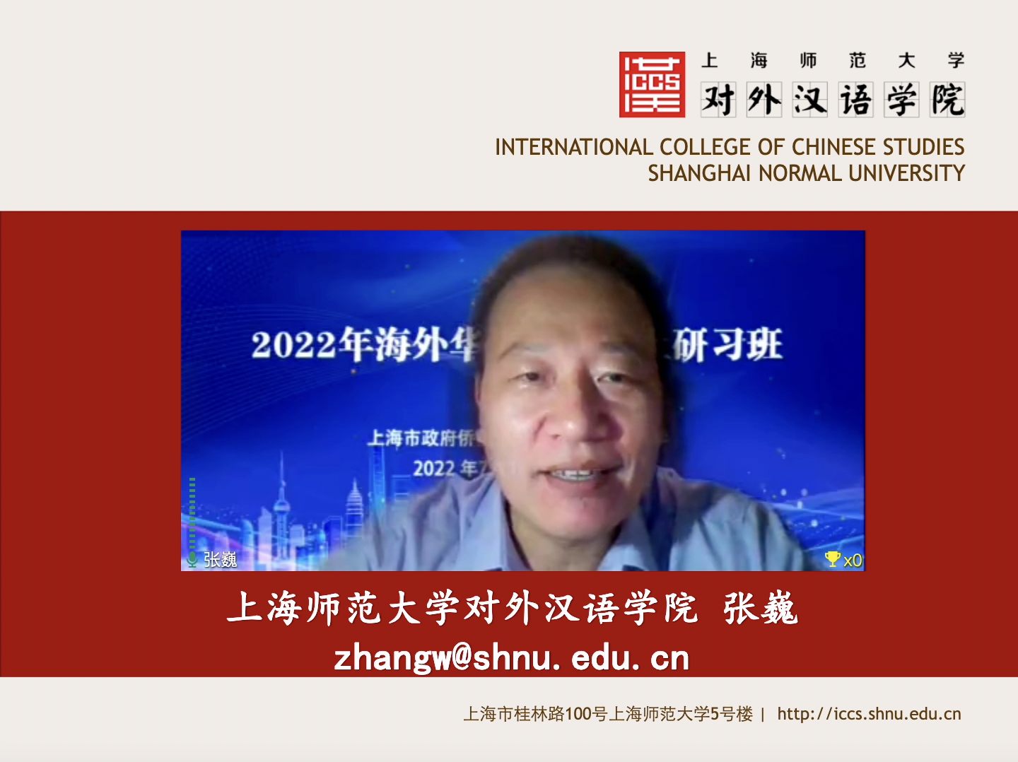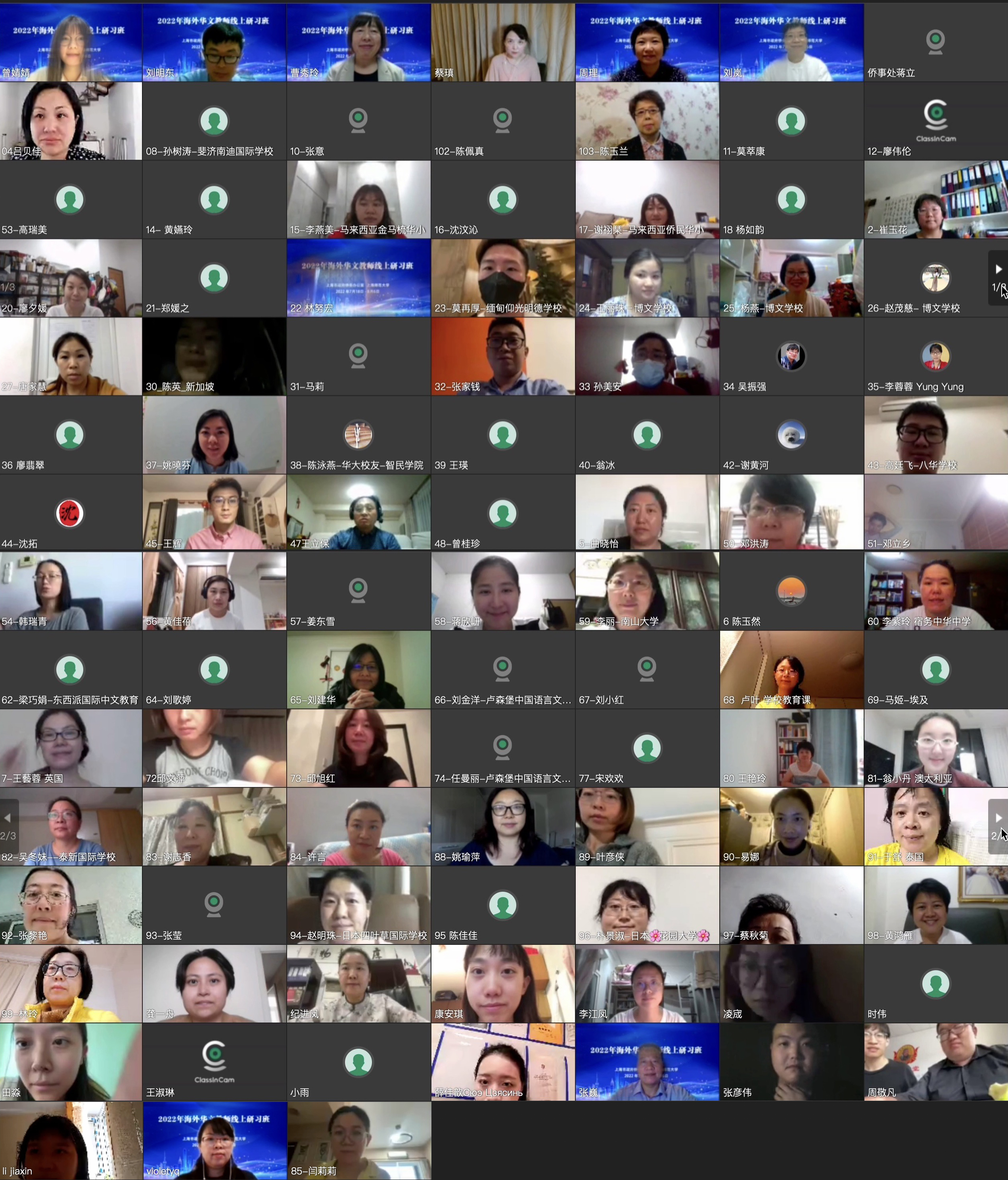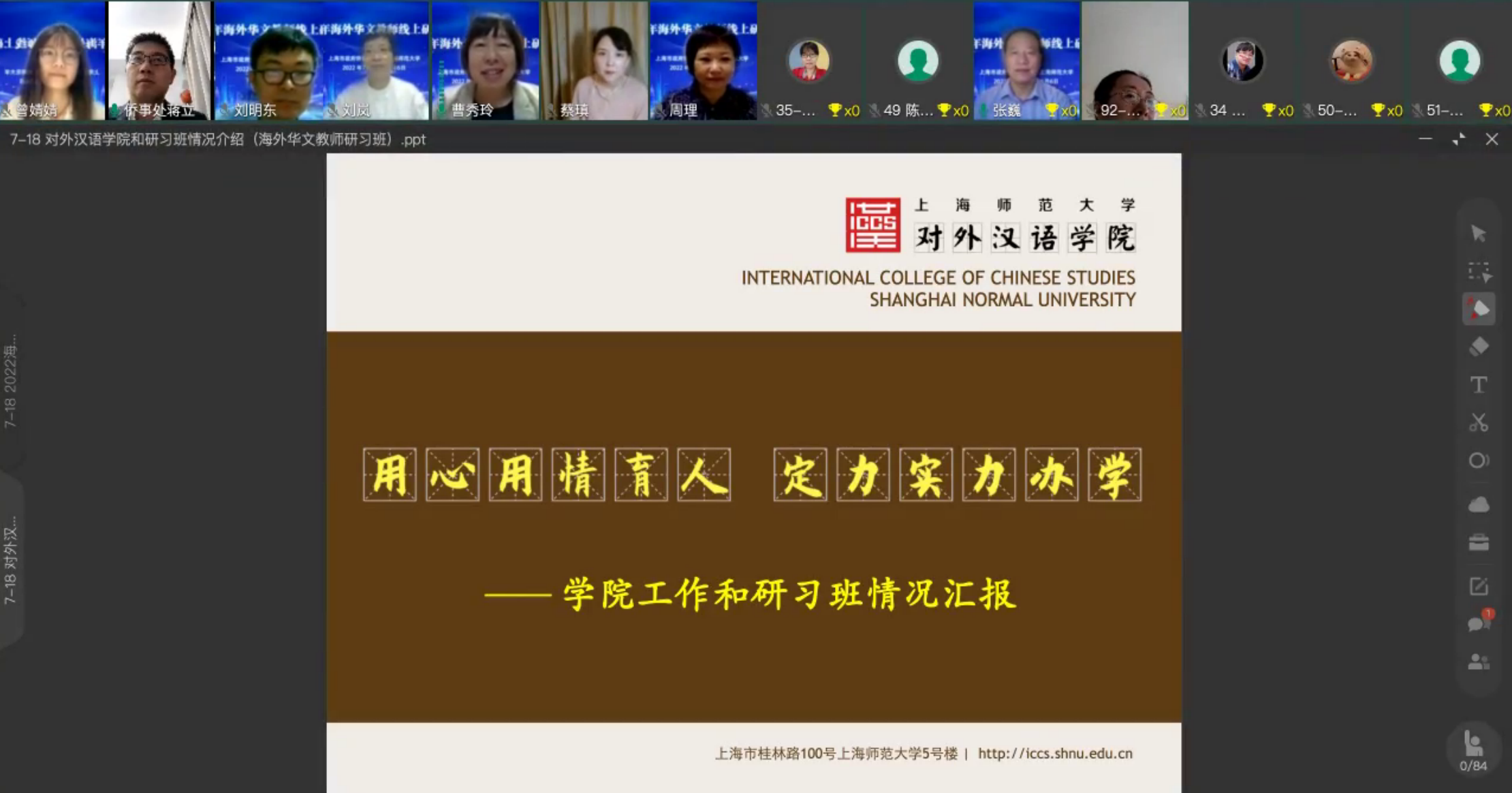 2022年7月18日北京时间19:00时,受国务院侨办委托,由上海市政府侨务办公室、上海师范大学篮球比分网 联合举办的“2022年海外华文教师研习班”开班仪式在ClassIn平台云端隆重举行。上海市政府侨务办公室副处长蒋立(主持工作)、晏青,学校统战部部长周理,篮球比分网 党委书记刘岚、院长曹秀玲、副院长张巍,篮球比分网 教师代表蔡瑱,研习班工作组和100余名海外华文教师相约线上,出席本次研习班开班式。开班式由篮球比分网 党委书记刘岚主持。
