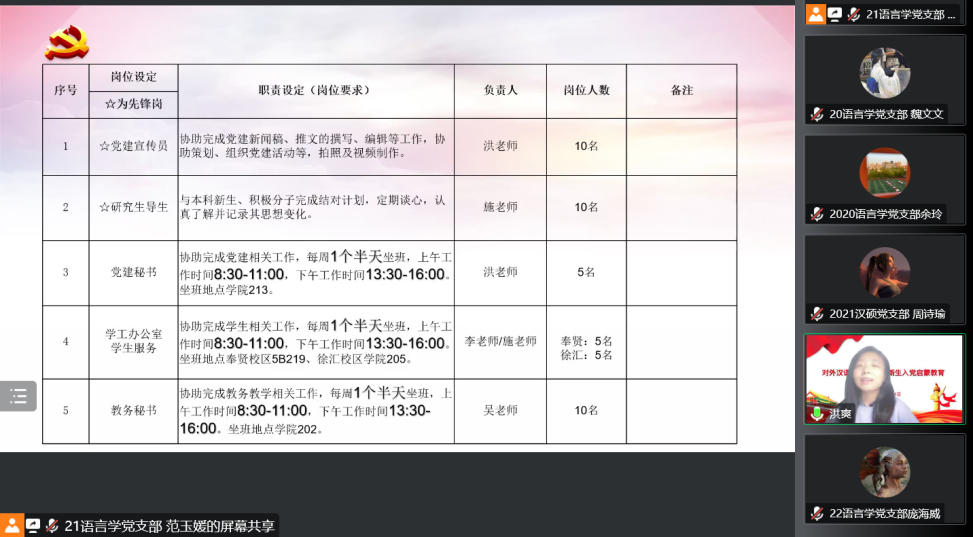 洪爽老师针对2022-2023学年学生党员“设岗定责”的具体岗位设置、岗位职责要求等内容进行了详细的解释说明,希望党员同志们都能在自己的岗位上有所思考、有所奉献、有所收获。