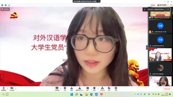 2020级语言学及应用语言学党支部吴文洁、本硕党支部孙茜、2021级语言学及应用语言学党支部毛翔作为2021-2022学年党员“设岗定责”优秀代表依次作岗位经验分享。作为经验丰富的党建宣传员,吴文洁从新闻稿的“三要素”出发,着重强调了新闻标题凝练性、稿件结构明晰性与照片比例协调性的重要。孙茜从研究生导生岗位的工作要求着手,细致介绍本科生结对的活动流程,并强调在结对沟通过程中耐心与热忱的重要。毛翔围绕办公室学生服务岗位所需的礼仪规范这一内容,通过具体情境的设立,以沉浸的方式,生动形象地向党员同志们阐释了基本礼仪规范在日常待人接物时的重要。