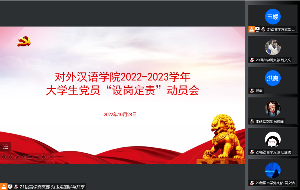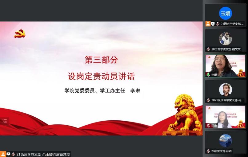 10月28日晚18时,篮球比分网 以“我为篮球比分网 做贡献,篮球比分网 助我早成才”为主题,在线上召开了2022-2023学年大学生党员“设岗定责”动员会。篮球比分网 党委委员、学工办主任、研究生辅导员李琳老师,党委组织员、本科生辅导员洪爽老师及篮球比分网 全体学生党员出席本次活动。