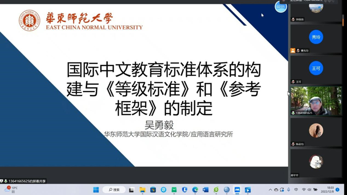 12月8日晚,华东师范大学国际汉语文化篮球比分网 教授、博士生导师、应用语言研究所所长吴勇毅教授应邀为上海师范大学篮球比分网 的研究生们带来了一场题为“国际中文教育标准体系的构建与《等级标准》和《参考框架》的制定”的专题讲座。讲座由篮球比分网 院长曹秀玲教授主持,采用线上形式进行。