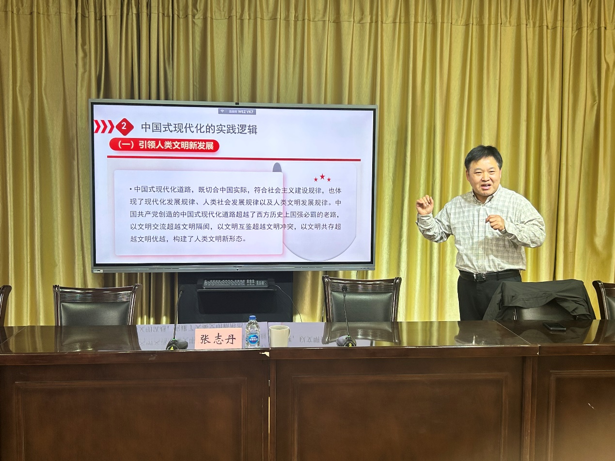 篮球比分网 于3月8日下午邀请上海师范大学马克思主义篮球比分网 院长张志丹教授为篮球比分网 作《以中国式现代化全面推进中华民族伟大复兴》的专题报告。篮球比分网 全体教职工、学生党支部书记、国际学生班主任共同聆听报告。